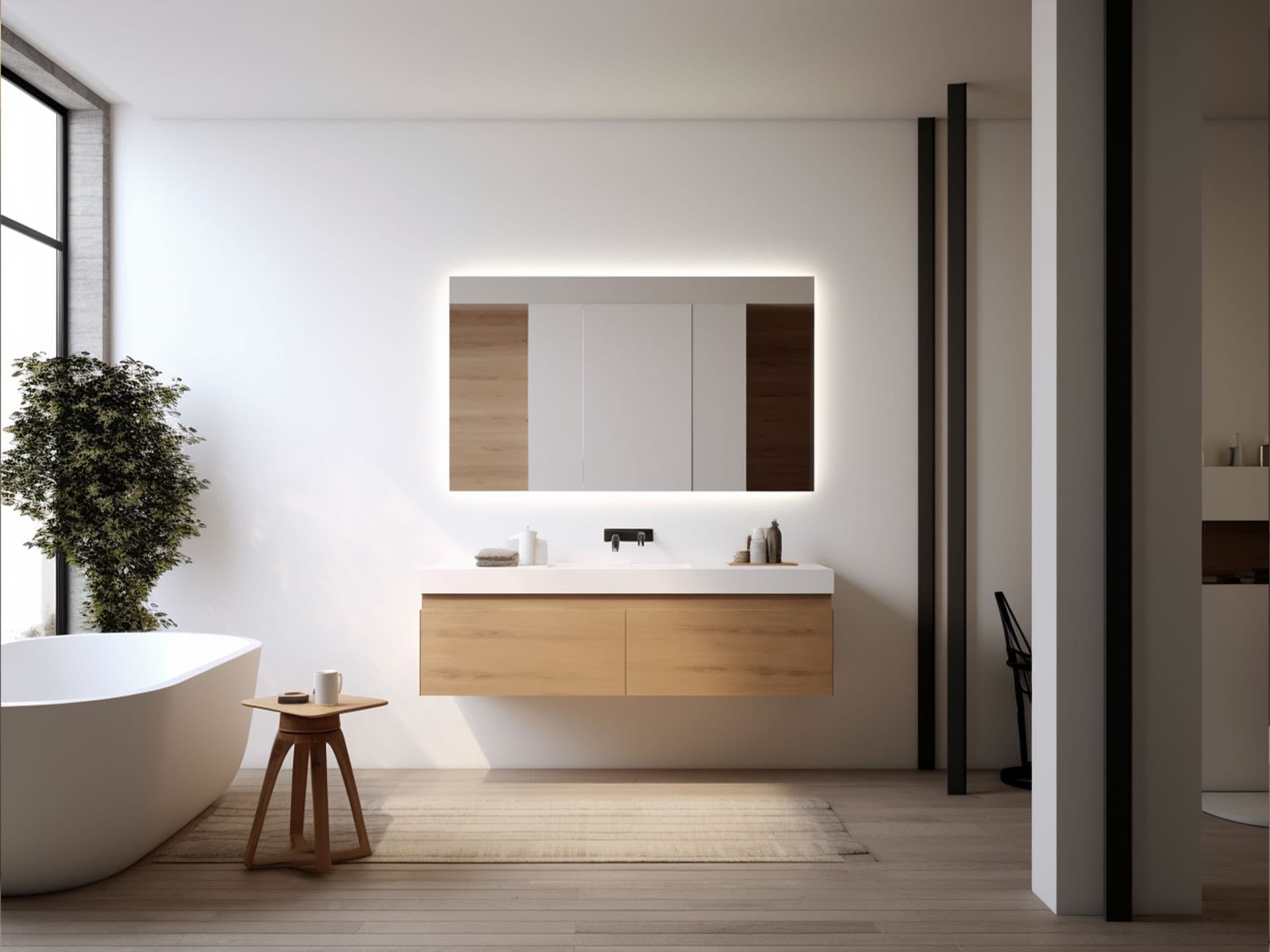 Der Lichtaustritt erfolgt indirekt zwischen Spiegel und Wand sowie dezent nach vorne – perfekt, um eine angenehme Atmosphäre im Bad zu erzeugen. Standardmäßig ist die Lichtfarbe **neutralweiß** eingestellt, da sie dem natürlichen Tageslicht entspricht und ideal für Tätigkeiten wie Schminken oder Rasieren geeignet ist.