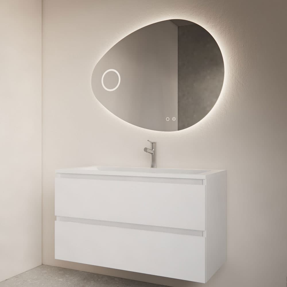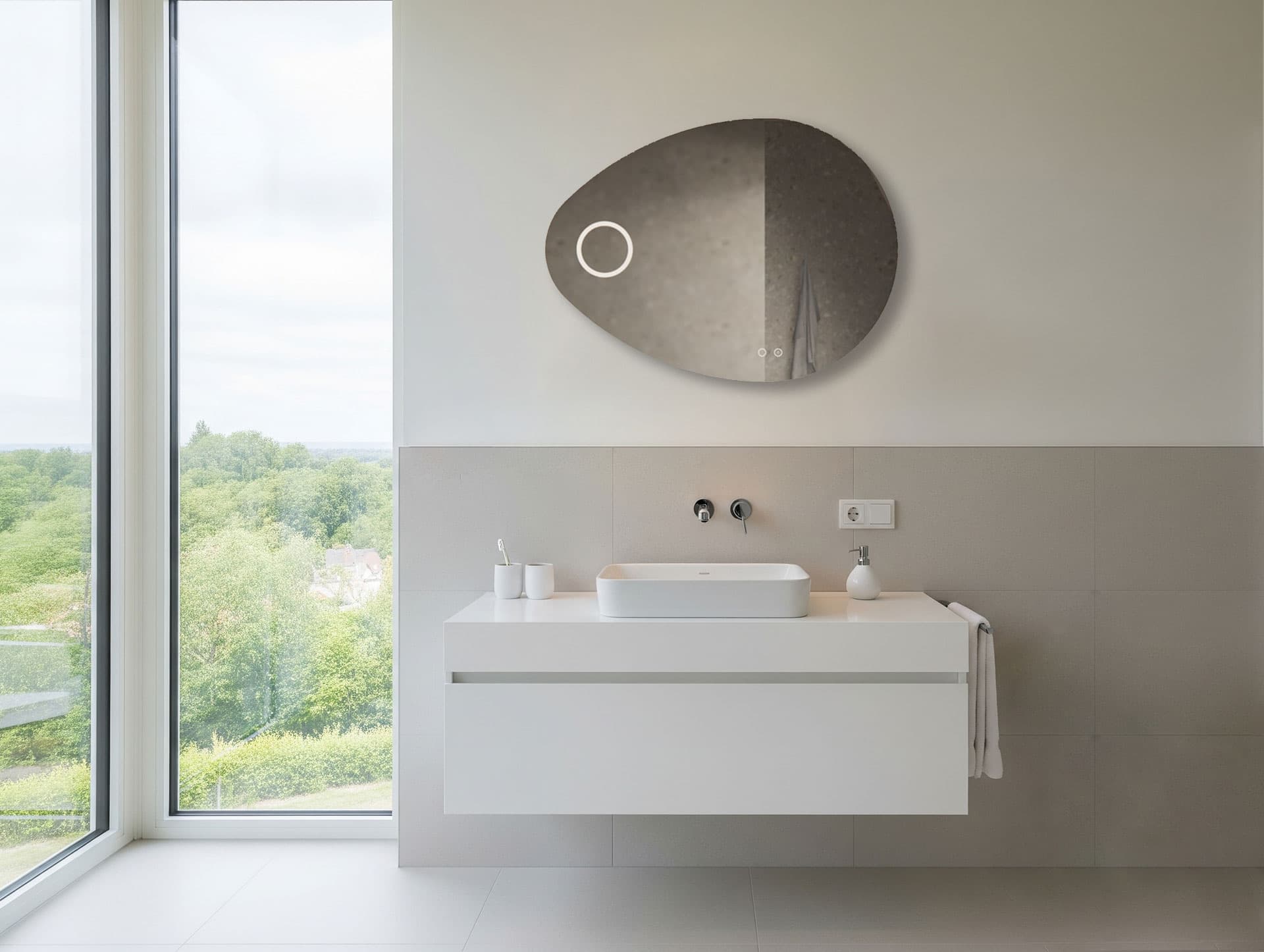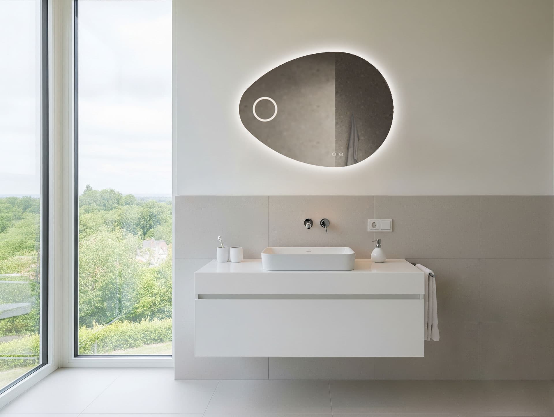 Dieser organisch geformte Spiegel von Gliss Design ist eine fantastische Ergänzung für Ihr Badezimmer. Er gehört zur Atlas-Serie und besticht durch sein einzigartiges Design mit einer wunderschönen Form, die für zusätzliche Beleuchtung in Ihrem Badezimmer sorgt. Der Spiegel ist hinterleuchtet, das heißt, das Licht scheint über den Rand des Spiegels an die Wand. Er verfügt außerdem über einen integrierten Rasierspiegel mit bis zu 9-facher Vergrößerung. Wenn das Licht ausgeschaltet ist, leuchtet der Touch-Button blau.