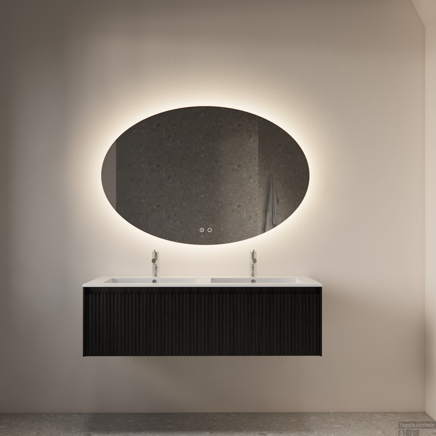 Dieser ovale, vertikale Spiegel ist 90 cm hoch und 140 cm breit. Er ist weder wendbar noch drehbar. Er verfügt über eine Touch-Taste zur einfachen Steuerung der Beleuchtung und eine Taste für die integrierte Spiegelheizung.