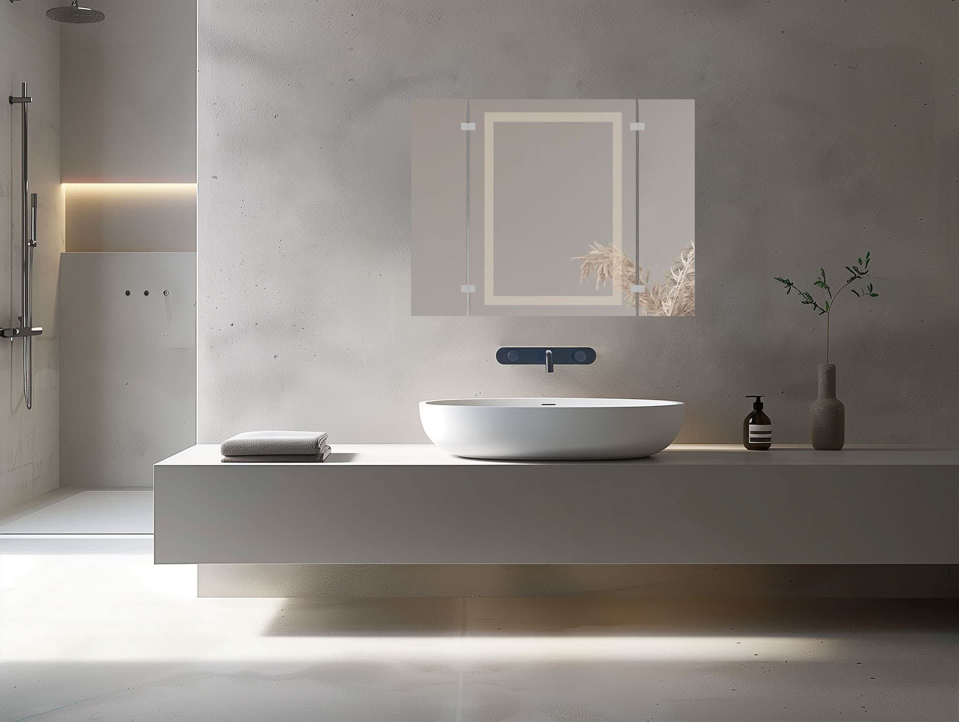 MAYAS ist ein Klappspiegel mit LED Beleuchtung. Flexibel, praktisch, angenehm vielfältig und elegant mit kristallklarer Ausstrahlung. Klappspiegel mit Beleuchtung für neue und bessere Sichtweisen. Dieser dreiteilige Spiegel ist ein Mehrwert für Ihr Badezimmer und mehr als ein praktisches Accessoire, diese ist auch im Schlafzimmer oder Flur - als ein Kunstwerk für sich zu betrachten. Hochwertige Spiegel jeweils mit silberfarbenen Messingscharnieren, wirken die drei hochglanzpolierte Spiegelelemente wie ein weit geöffnetes Fenster.