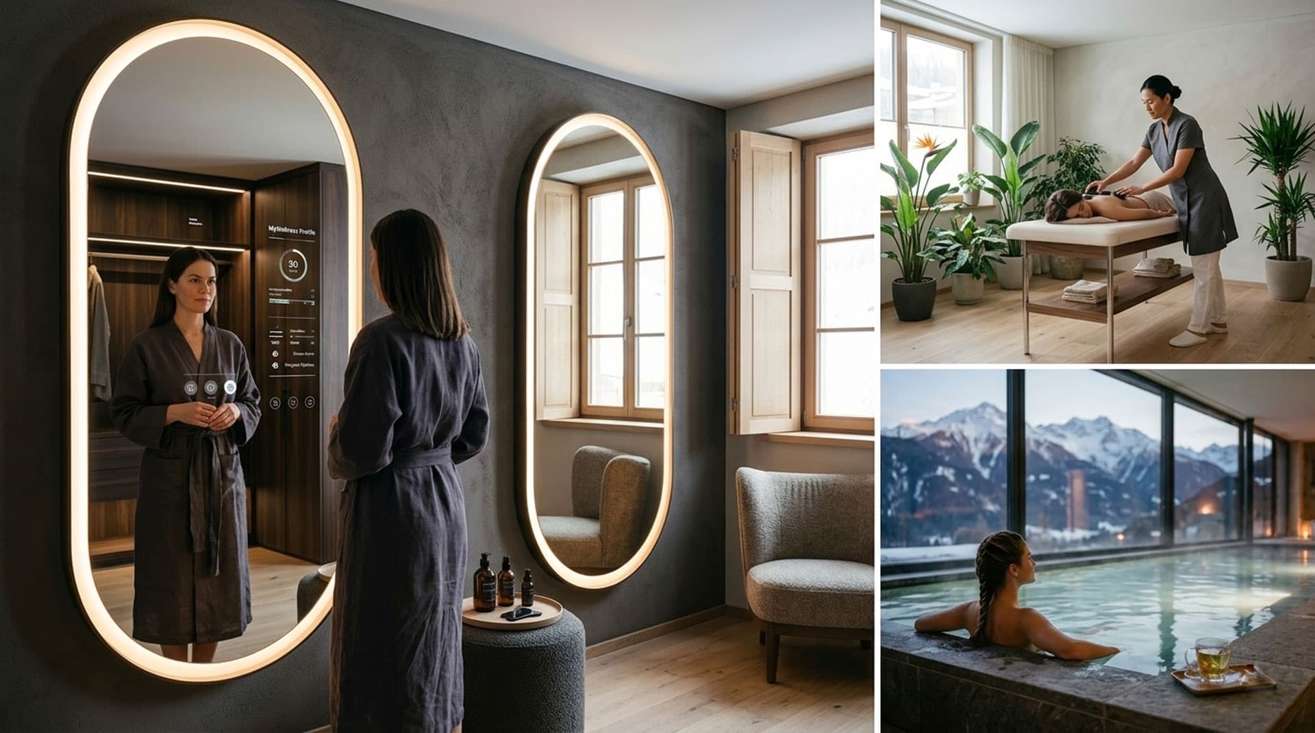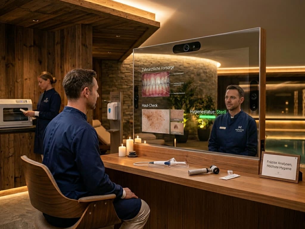 Integrierte Sensoren erfassen beim Blick in den Spiegel Herzfrequenz und Stresslevel. In der Ästhetik visualisieren Spiegel Hautanalysen oder simulieren Behandlungsergebnisse.