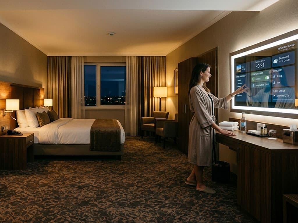 In der modernen Hotellerie verschmelzen Luxus und Technologie. Gäste regulieren Licht, Temperatur und Raummusik direkt über Touch-Flächen oder informieren sich über Hotelangebote.