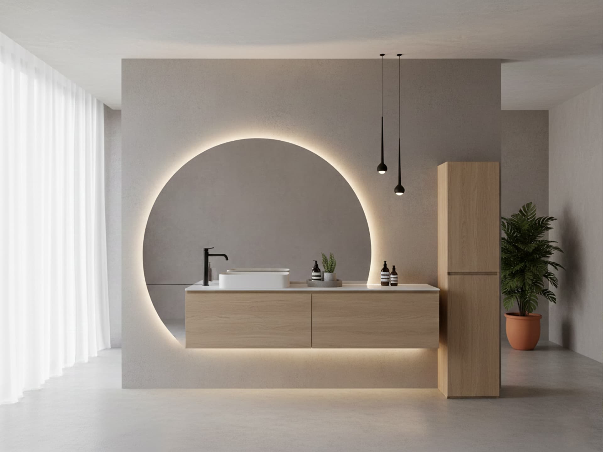 Verleihen Sie Ihrem Badezimmer, Schlafzimmer oder Ihrer Garderobe ein modernes Highlight mit diesem maßgefertigten halbrunden Spiegel – bestehend aus zwei passgenauen Teilen, die gemeinsam eine harmonische, elegante Form ergeben.
