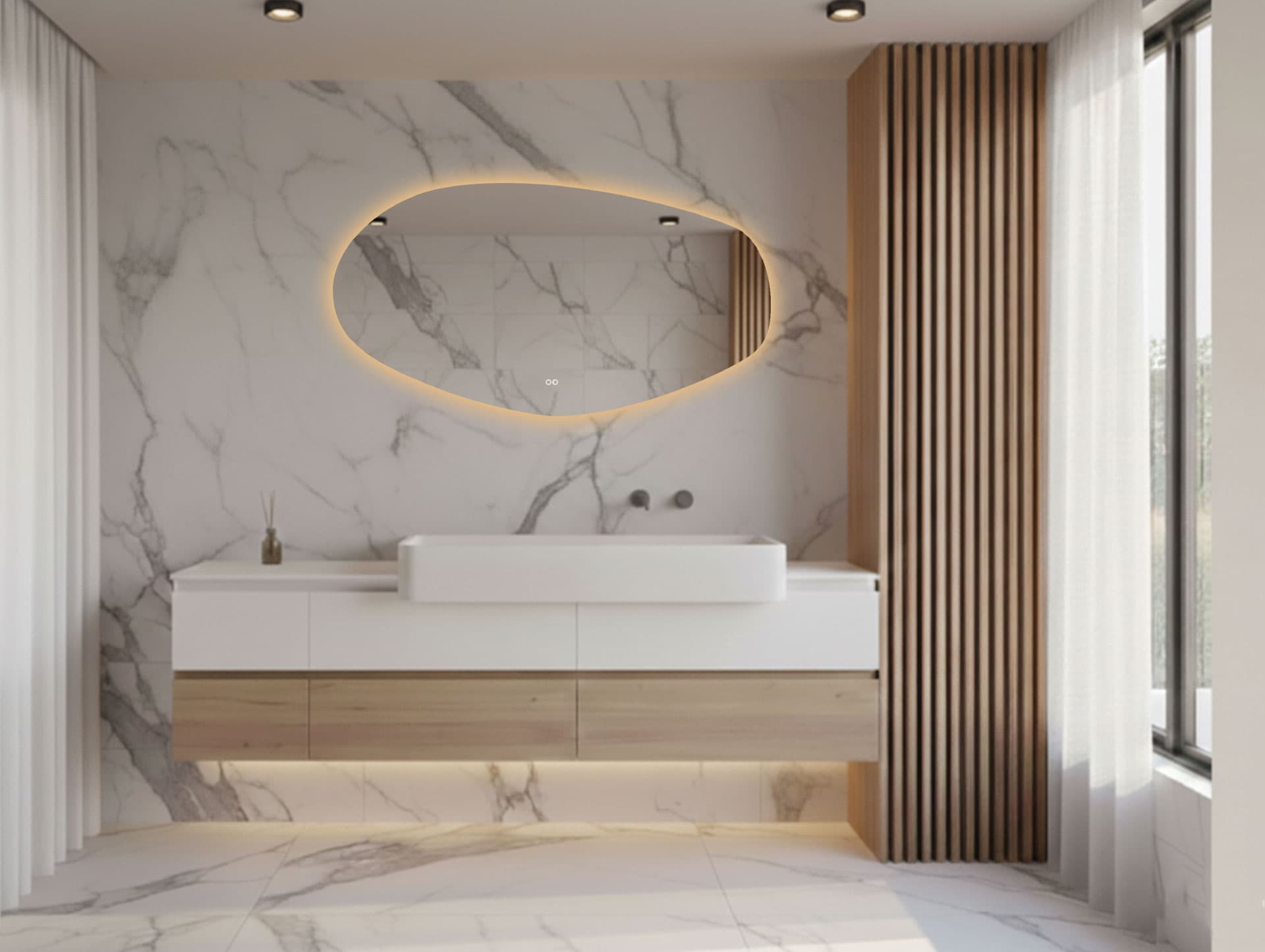 Die Kombination aus organischem Design, verstellbarer Beleuchtung und kondensfreiem Spiegel heißt Sie jeden Tag in einem Badezimmer willkommen, das sich wie ein persönliches Spa anfühlt.