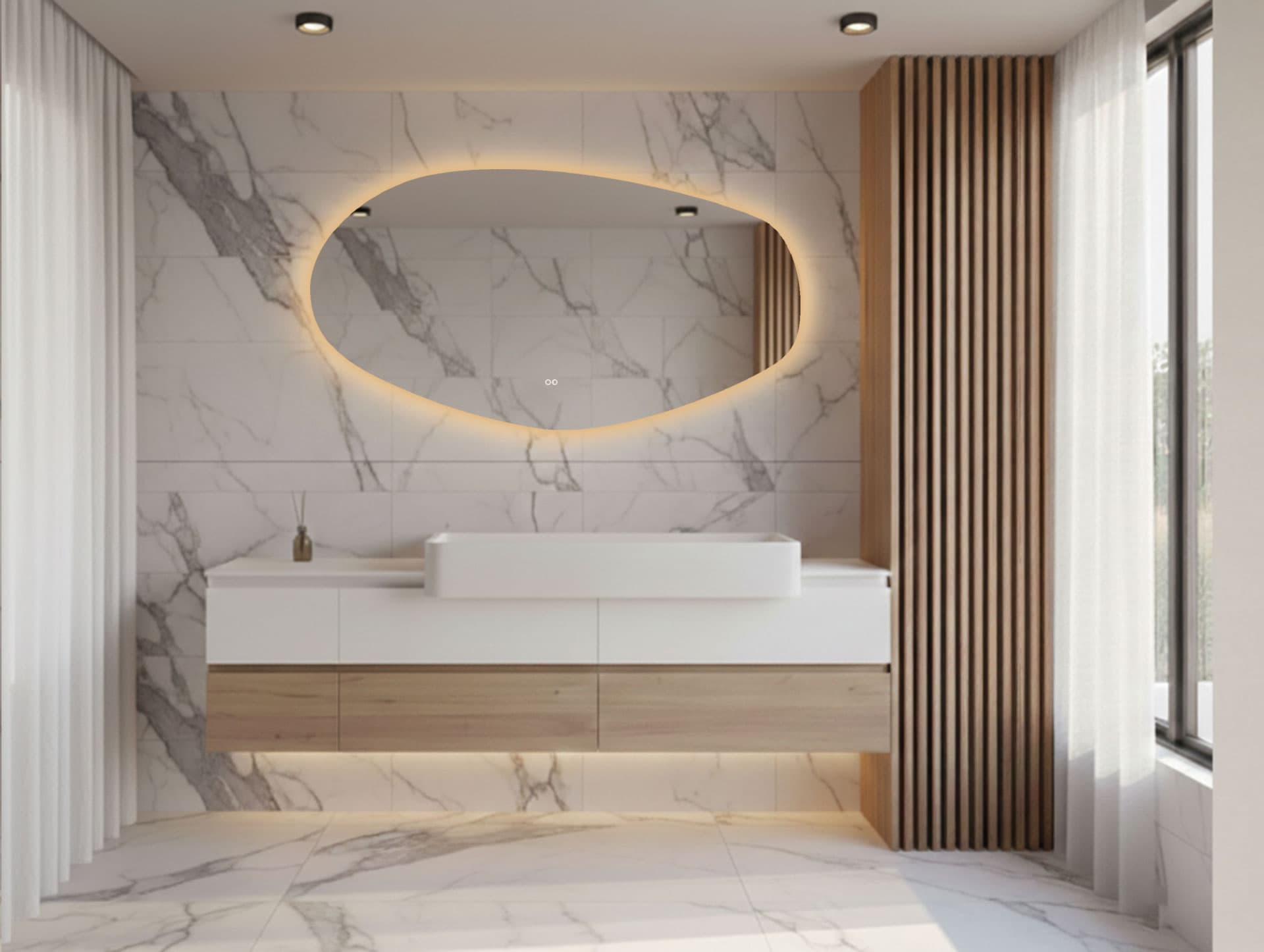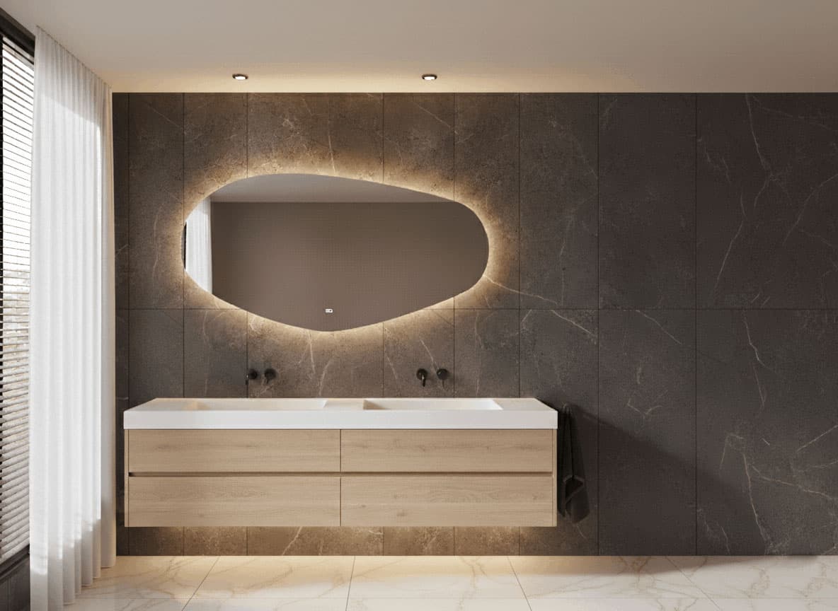 Dieser organisch geformte Spiegel mit indirekter Beleuchtung ist der neue Trend fürs Badezimmer. Seine fließende Form und das sanfte Licht schaffen eine warme und einladende Atmosphäre.