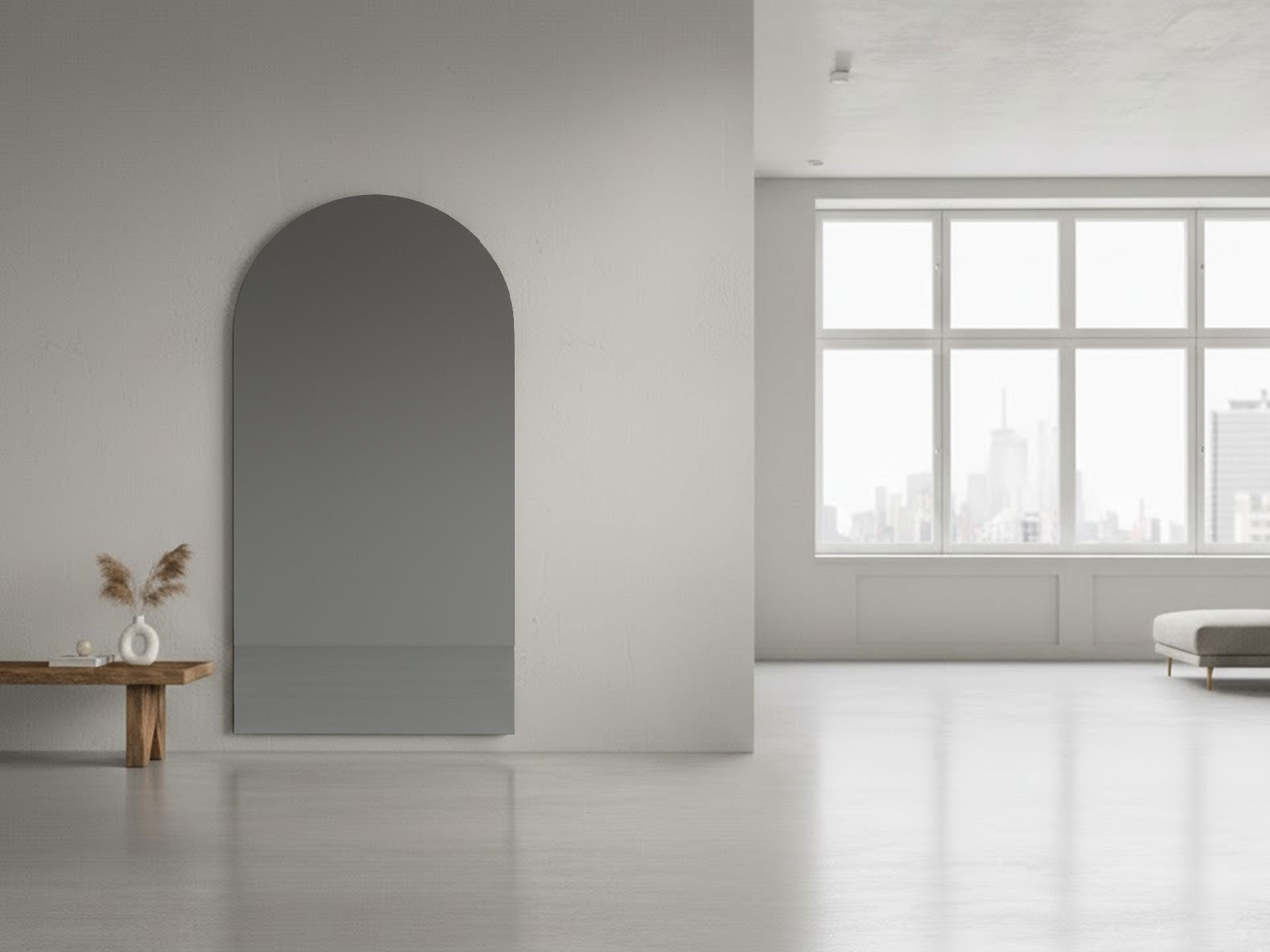 Große Bogenspiegel helfen, Ihren Raum zu öffnen und durch die Illusion der Reflexion Schönheit zu erzeugen. Im Allgemeinen sollten Bogenspiegel auf dem Boden oder an größeren Wänden montiert werden. In manchen Fällen ist es am besten, Ihren Ganzkörperspiegel oder Bogenspiegel nicht gegenüber Fenstern zu platzieren, um die Reflexion von störendem Sonnenlicht oder Blendung zu vermeiden. Wir empfehlen, Ihren Bogenspiegel mit der mitgelieferten Halterung an einer Wand zu befestigen.
